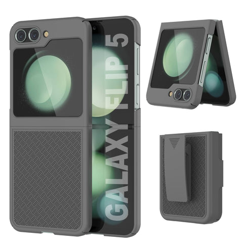 Punkcase Galaxy Z Flip5 Case With Tempered Glass Screen Protector, Holster Belt Clip & Built-In Kickstand Non Slip Dual Layer Hybrid TPU Full Body Protection [Thin Fit] for Samsung Galaxy Z Flip5 [Grey]