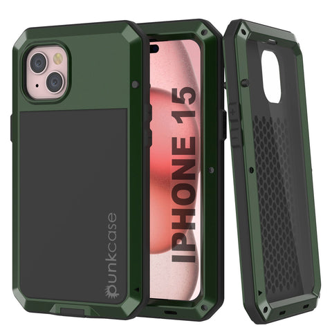 iPhone 15 Metal Case, Heavy Duty Military Grade Armor Cover [shock proof] Full Body Hard [Dark Green]