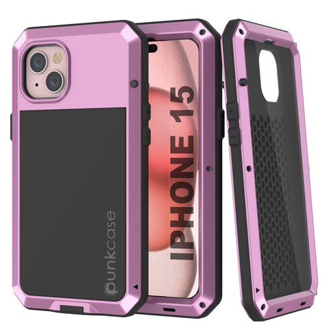 iPhone 15 Metal Case, Heavy Duty Military Grade Armor Cover [shock proof] Full Body Hard [Pink]