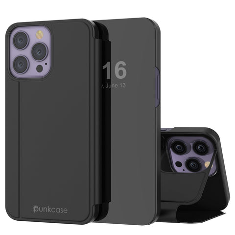 Punkcase iPhone 14 Pro Reflector Case Protective Flip Cover [Black]