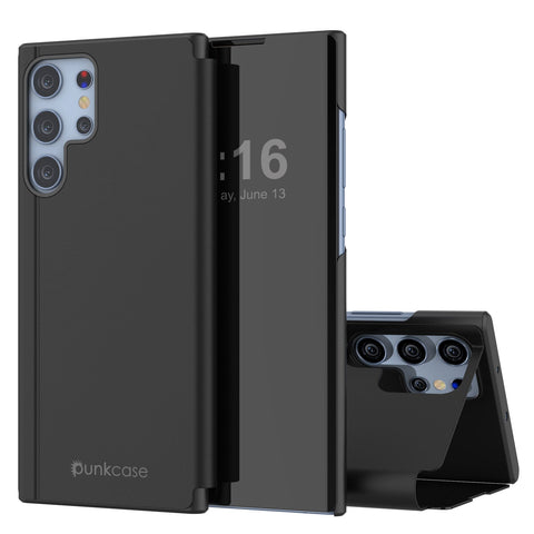 Punkcase S23 Ultra Reflector Case Protective Flip Cover W/Scratch Resistant Translucent Mirror Front & Non-Slip PU Leather Back Integrated Kickstand Compatible W/Samsung S23 Ultra (Black)